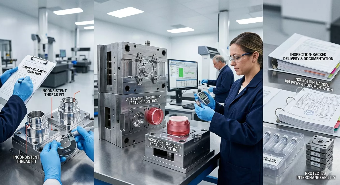 Os moldes para embalagens de cuidados com a pele têm um ponto de pressão diferente. A peça moldada deve ter uma aparência premium, mas também deve abrir, fechar, vedar e montar de forma consistente. Isso significa que as superfícies visíveis, a sensação da tampa, a margem de polimento e a geometria relacionada ao ajuste são importantes ao mesmo tempo.