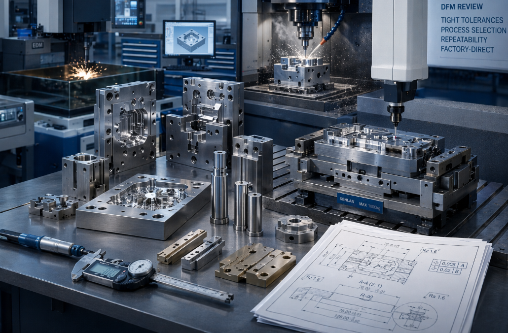 Na SENLAN, nossos serviços de ferramentas personalizadas concentram-se em componentes de moldes, acessórios, medidores e ferramentas de produção de ajuste crítico usadas para dar suporte à moldagem por injeção, construção de moldes e fabricação de precisão. Não posicionamos isso como trabalho de máquina de uso geral. O objetivo é construir ferramentas que funcionem na produção, e não apenas peças que sejam medidas corretamente uma vez.